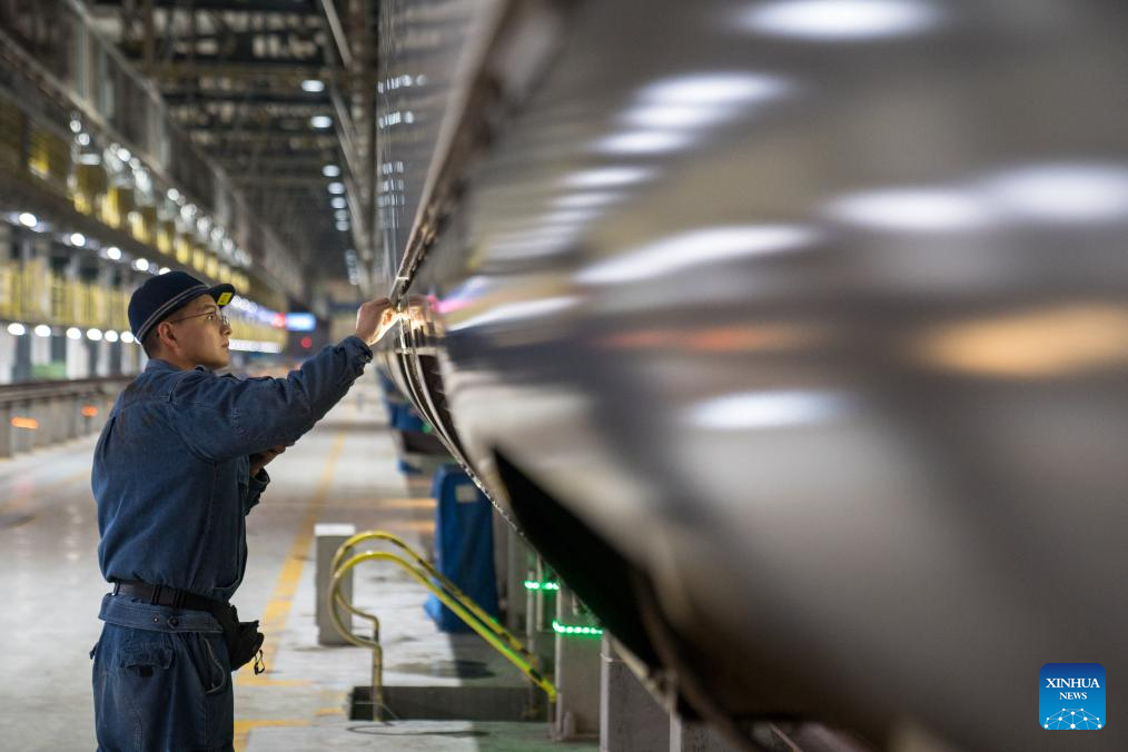 A staff member checks the surface of a bullet train at a maintenance base in Nanning, south China's Guangxi Zhuang Autonomous Region, Jan. 14, 2025. The Spring Festival travel rush of this year started on Tuesday. Staff members at the maintenance bases of the country's railway operators are busy servicing trains to ensure their normal operations during the travel rush. (Xinhua/Cao Yiming)