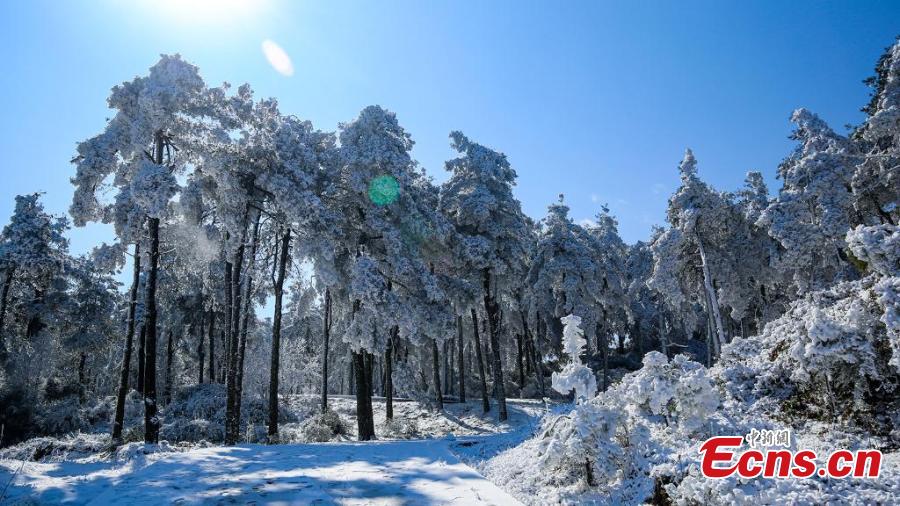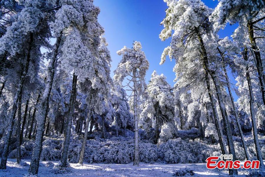 Yushe National Forest Park is turned toa white fairyland by snow and rime in Liupanshui, southwest China's Guizhou Province, Jan. 12, 2025. (China News Service/Zhao Hua)