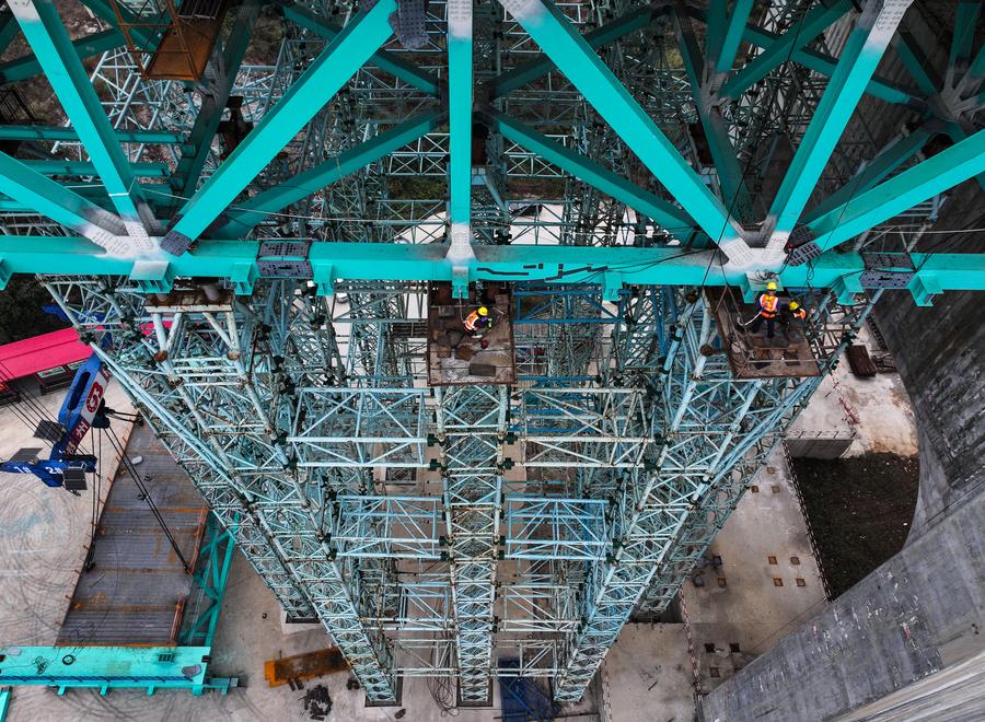 An aerial drone photo shows workers working at the construction site of the Huajiang grand canyon bridge in southwest China's Guizhou, Jan. 14, 2025. (Xinhua/Yang Wenbin)