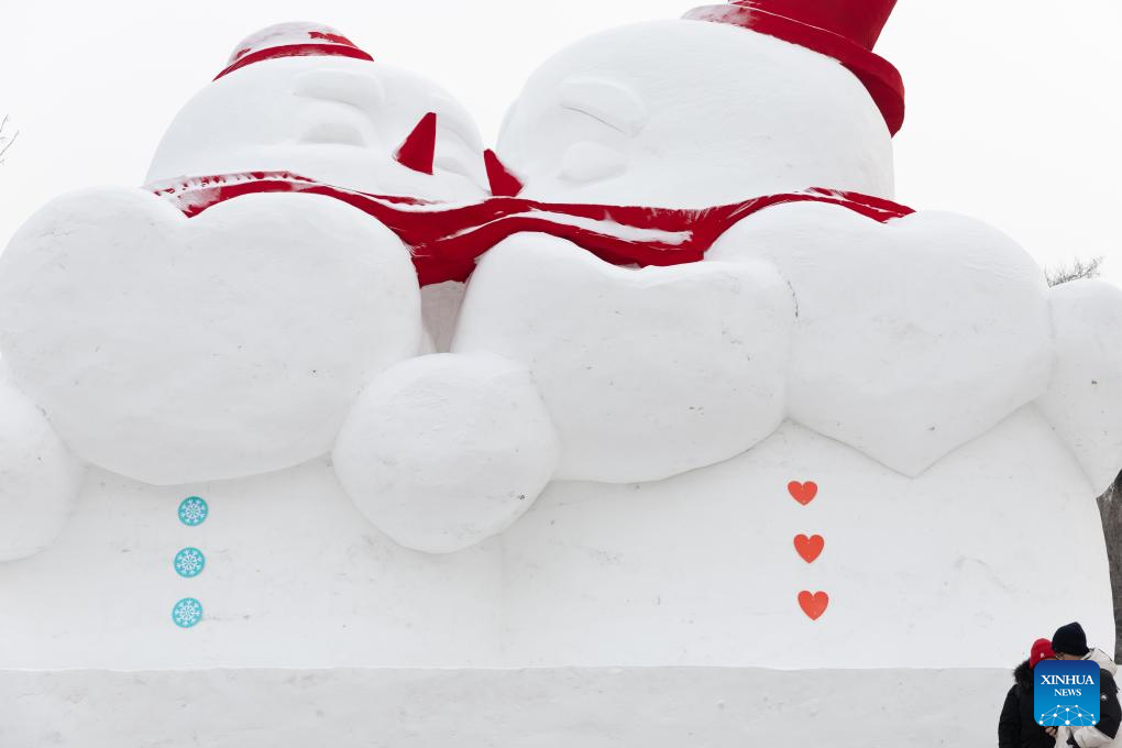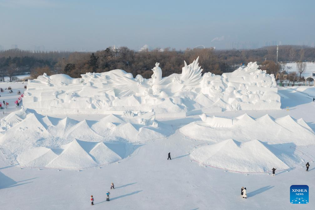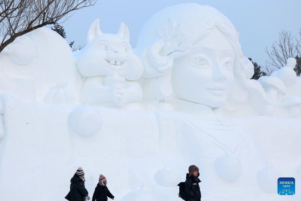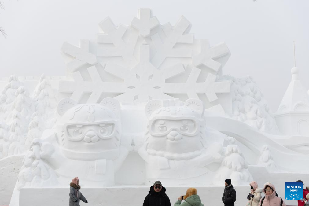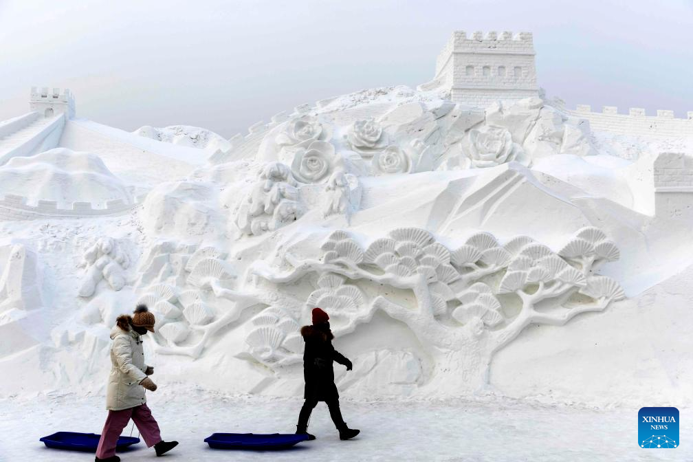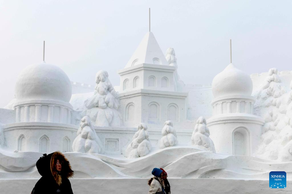 Tourists walk past a snow sculpture at the Sun Island International Snow Sculpture Art Expo park in Harbin, northeast China's Heilongjiang Province, Jan. 13, 2025. Harbin is currently in the midst of its peak ice and snow tourism season. Various high-level snow sculpture competitions are being held, and snow sculptures located across numerous attractions in the city create a unique winter landscape, allowing visitors to experience the charm of ice and snow art. (Xinhua/Zhang Tao)