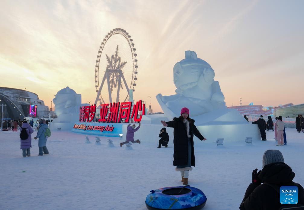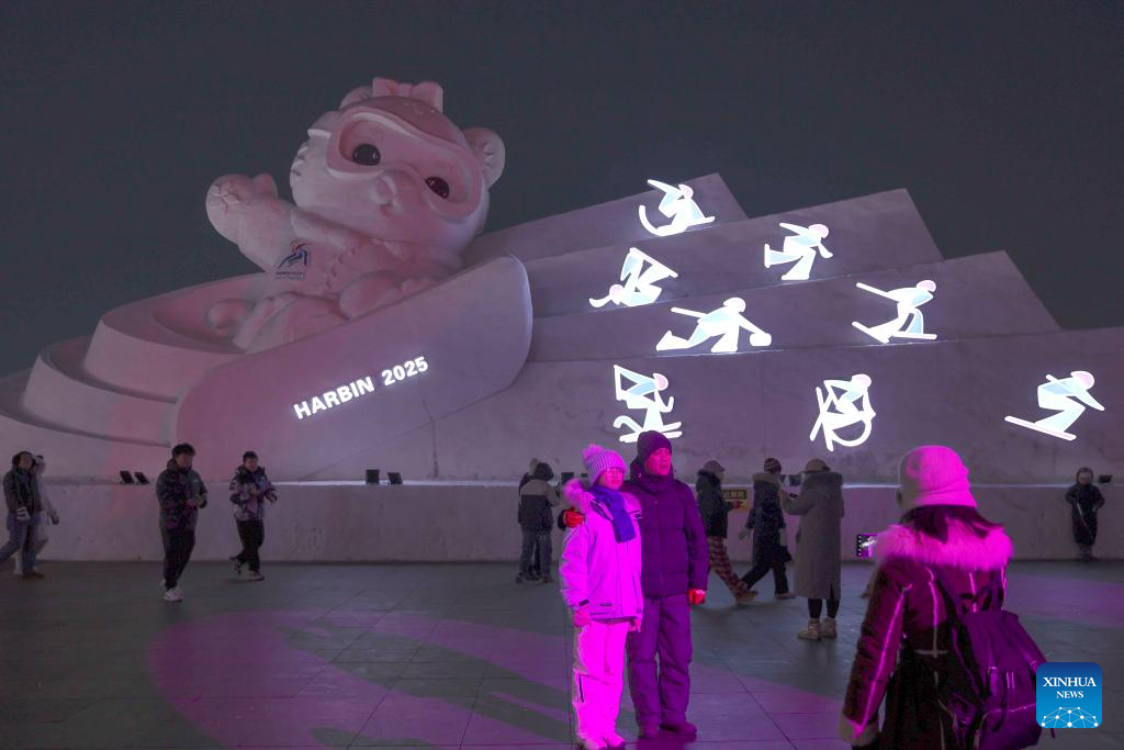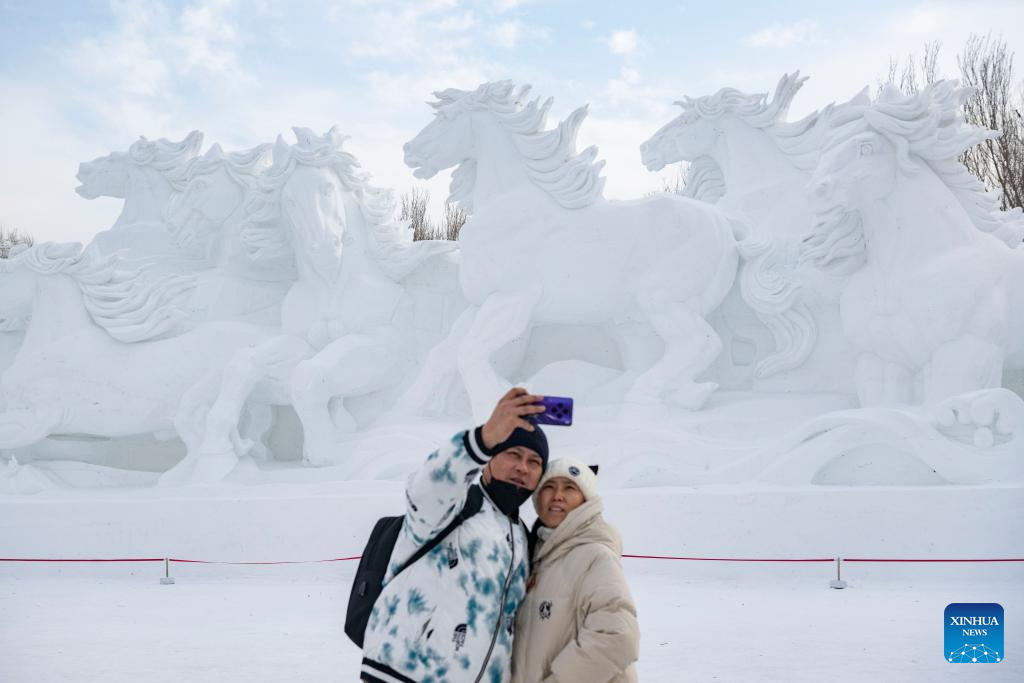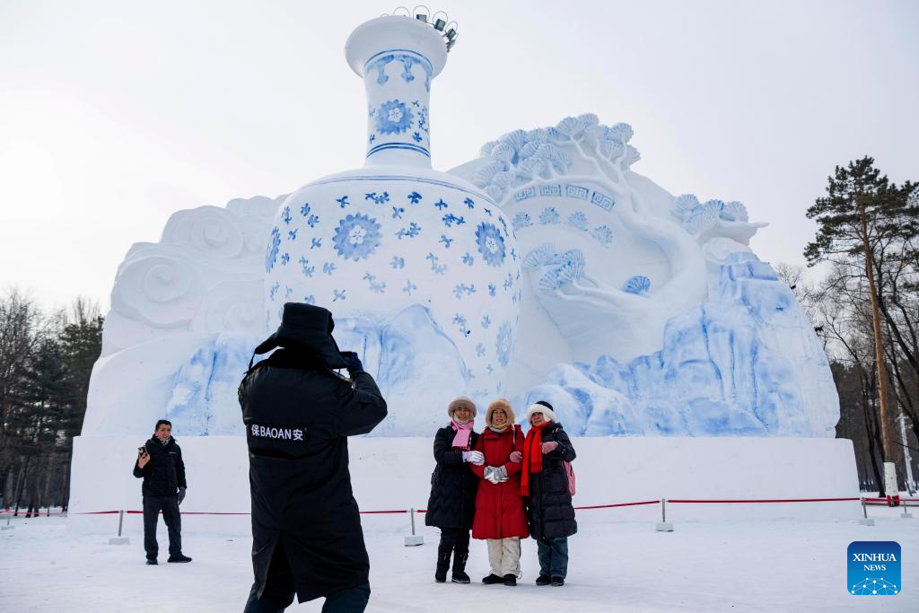 Tourists take photos at Harbin Songhua River Ice and Snow Carnival in Harbin, northeast China's Heilongjiang Province, Jan. 13, 2025. Harbin is currently in the midst of its peak ice and snow tourism season. Various high-level snow sculpture competitions are being held, and snow sculptures located across numerous attractions in the city create a unique winter landscape, allowing visitors to experience the charm of ice and snow art. (Xinhua/Zhang Tao)