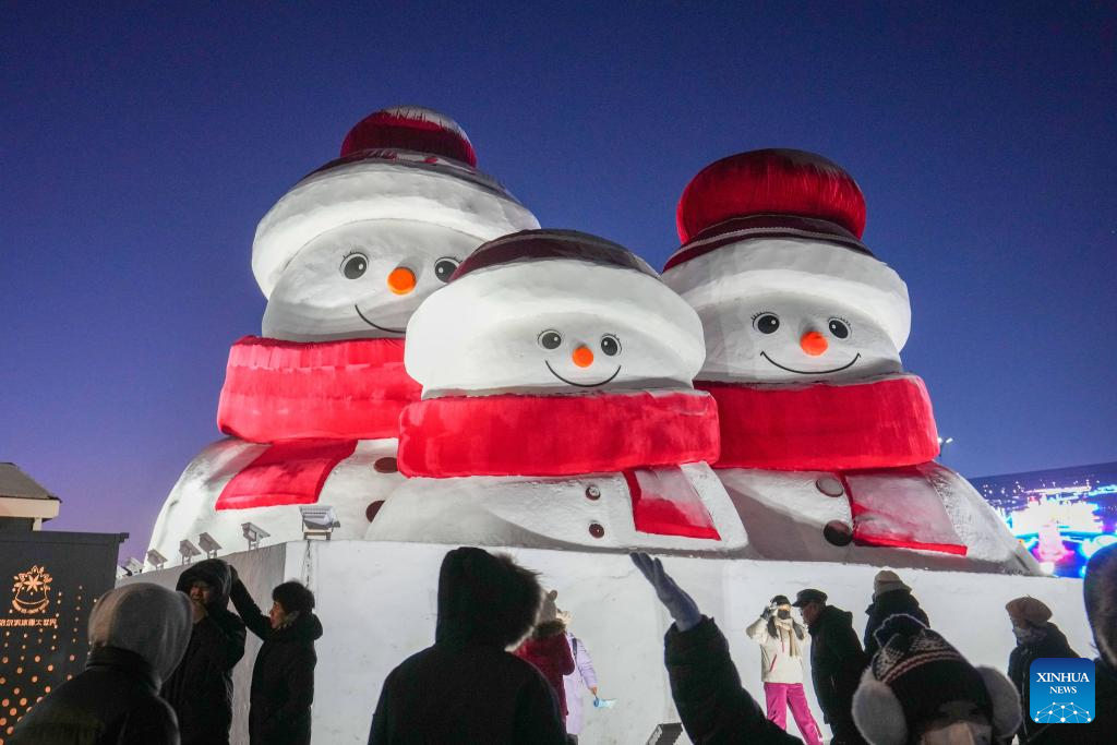 Tourists take photos near a snow sculpture at the Harbin Ice-Snow World in Harbin, northeast China's Heilongjiang Province, Jan. 5, 2025. Harbin is currently in the midst of its peak ice and snow tourism season. Various high-level snow sculpture competitions are being held, and snow sculptures located across numerous attractions in the city create a unique winter landscape, allowing visitors to experience the charm of ice and snow art. (Xinhua/Wang Jianwei)