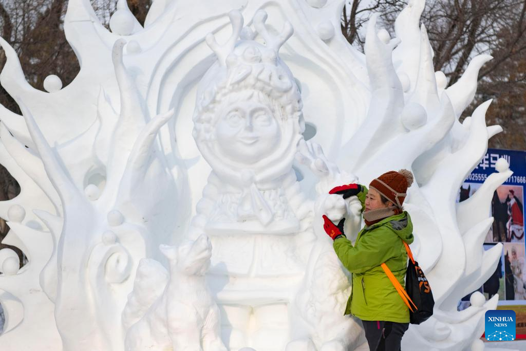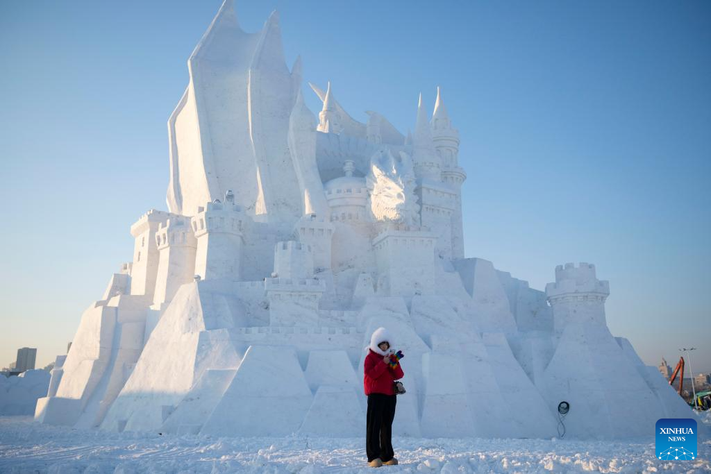 Tourists take photos near a snow sculpture at the Sun Island International Snow Sculpture Art Expo park in Harbin, northeast China's Heilongjiang Province, Jan. 13, 2025. Harbin is currently in the midst of its peak ice and snow tourism season. Various high-level snow sculpture competitions are being held, and snow sculptures located across numerous attractions in the city create a unique winter landscape, allowing visitors to experience the charm of ice and snow art. (Xinhua/Xie Jianfei)