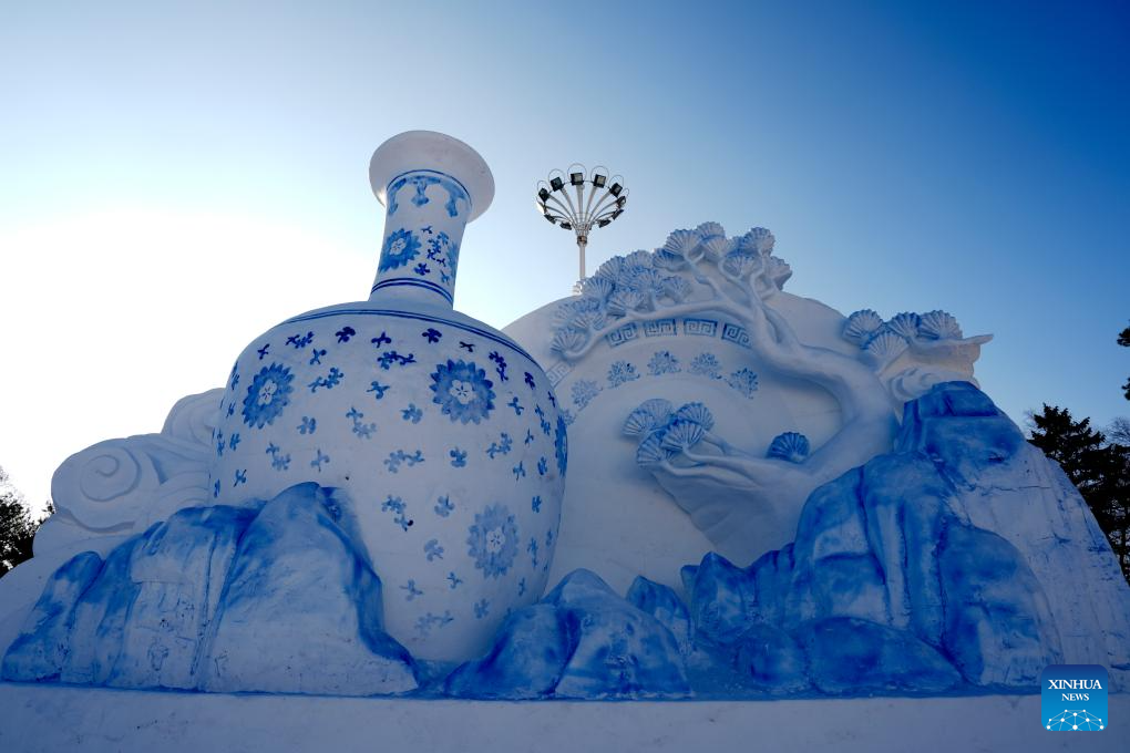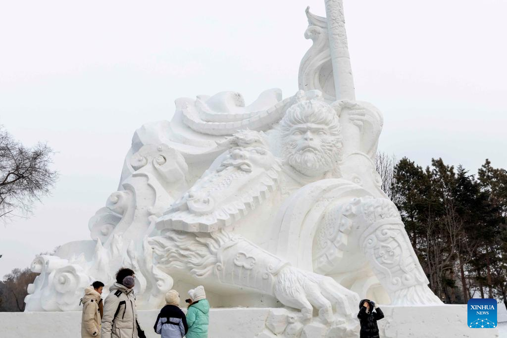 A snow sculpture is pictured at the Sun Island International Snow Sculpture Art Expo park in Harbin, northeast China's Heilongjiang Province, Jan. 11, 2025. Harbin is currently in the midst of its peak ice and snow tourism season. Various high-level snow sculpture competitions are being held, and snow sculptures located across numerous attractions in the city create a unique winter landscape, allowing visitors to experience the charm of ice and snow art. (Xinhua/Wang Song)