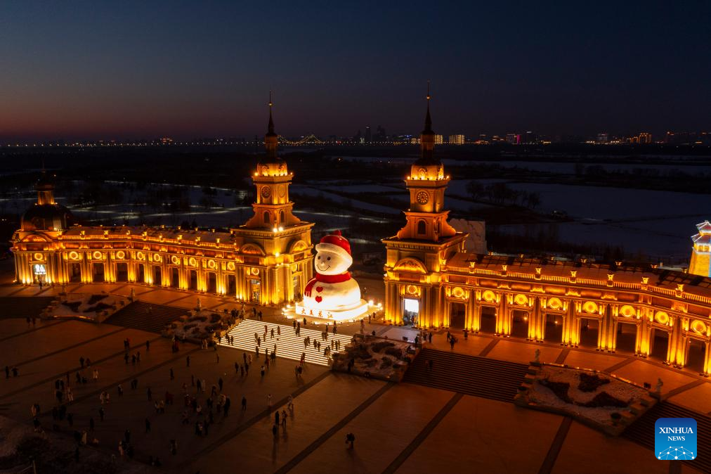 An aerial drone photo taken on Jan. 3, 2025 shows people having fun around a giant snowman near the Qunli music park in Harbin, northeast China's Heilongjiang Province. Harbin is currently in the midst of its peak ice and snow tourism season. Various high-level snow sculpture competitions are being held, and snow sculptures located across numerous attractions in the city create a unique winter landscape, allowing visitors to experience the charm of ice and snow art. (Xinhua/Xie Jianfei)