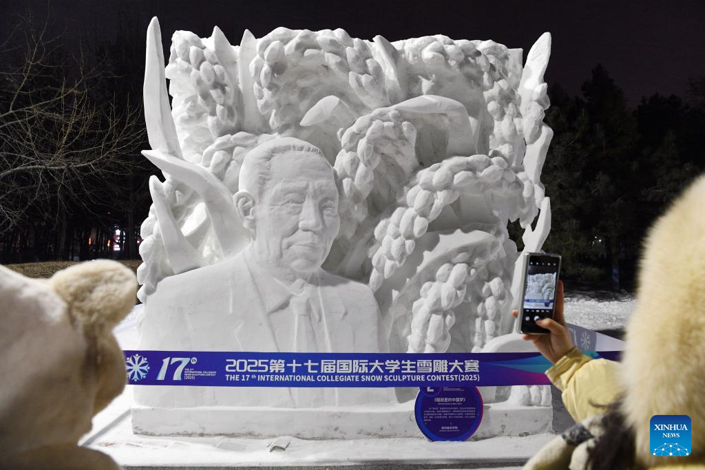Visitors take photos of a snow sculpture featuring the late legendary Chinese scientist Yuan Longping at Harbin Engineering University in Harbin, northeast China's Heilongjiang Province, Jan. 7, 2025. Harbin is currently in the midst of its peak ice and snow tourism season. Various high-level snow sculpture competitions are being held, and snow sculptures located across numerous attractions in the city create a unique winter landscape, allowing visitors to experience the charm of ice and snow art. (Photo by Liu Yang/Xinhua)
