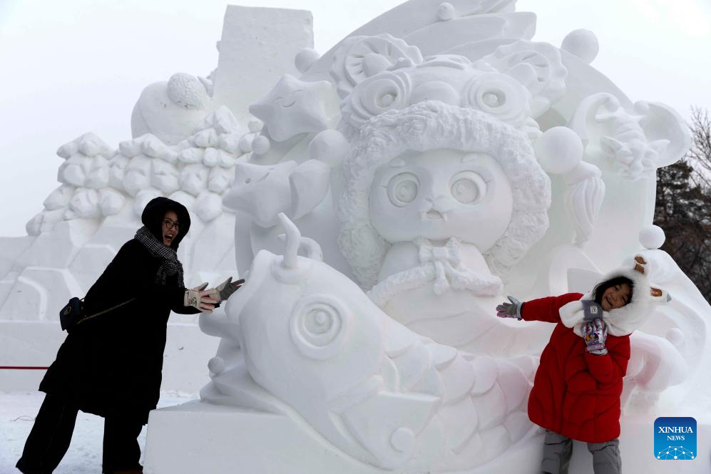 Tourists take photos at a snow sculpture near the Harbin Ice-Snow World in Harbin, northeast China's Heilongjiang Province, Jan. 5, 2025. Harbin is currently in the midst of its peak ice and snow tourism season. Various high-level snow sculpture competitions are being held, and snow sculptures located across numerous attractions in the city create a unique winter landscape, allowing visitors to experience the charm of ice and snow art. (Xinhua/Wang Jianwei)