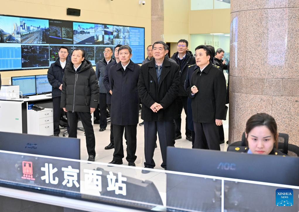 Chinese Vice Premier He Lifeng, also a member of the Political Bureau of the Communist Party of China Central Committee, inspects the Beijing West Railway Station in Beijing, capital of China, Jan. 14, 2025. He urged all relevant regions, departments and enterprises to ensure safe and convenient Spring Festival travel, as well as the smooth operation of transportation and logistics, during an inspection of transport hubs in Beijing, including the Beijing Daxing International Airport and the Beijing West Railway Station. (Xinhua/Yin Bogu)