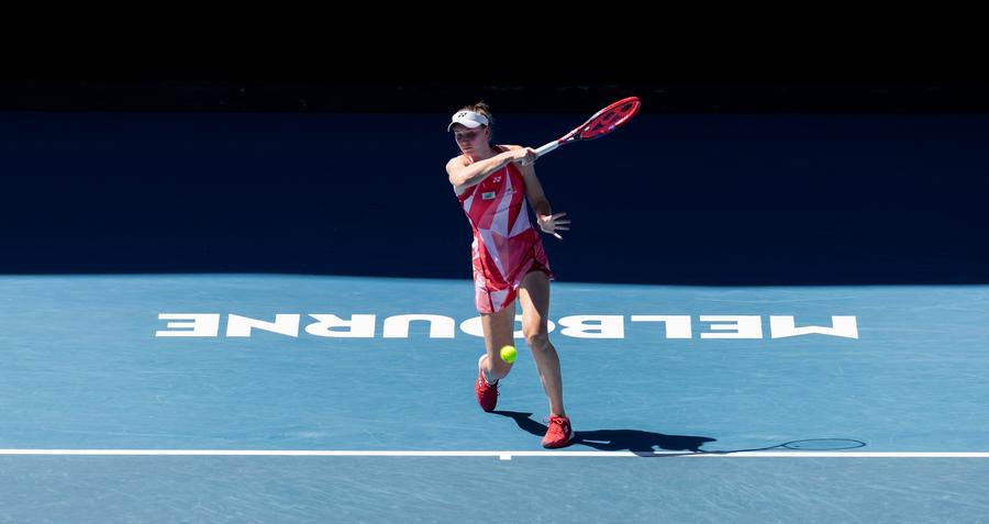 Kazakhstan's Elena Rybakina hits a return during the women's singles first-round match against Australia's Emerson Jones. (Photo by Hu Jingchen/Xinhua)