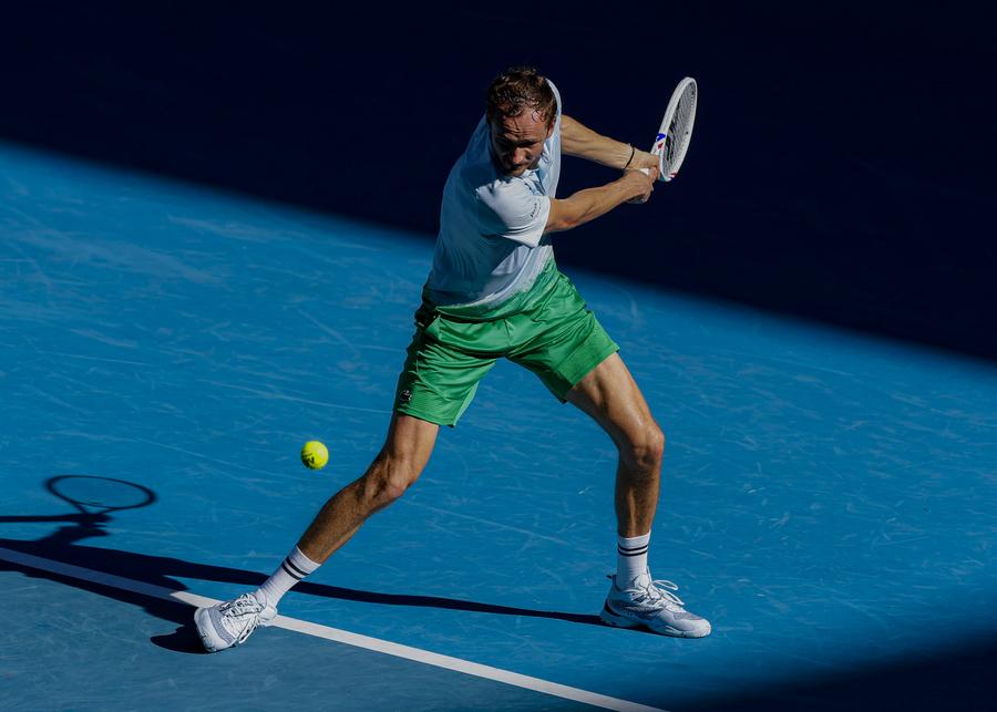 Russia's Daniil Medvedev hits a return during the men's singles first-round match against Thailand's Kasidit Samrej at the Australian Open in Melbourne, Australia, on Jan. 14, 2025. (Photo by Chu Chen/Xinhua)