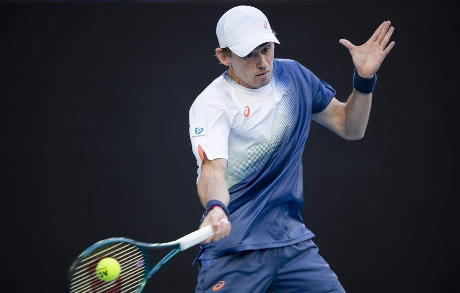 Australia's Alex de Minaur hits a return during the match against Netherlands' Botic van de Zandschulp. (Xinhua/Lui Siu Wai)