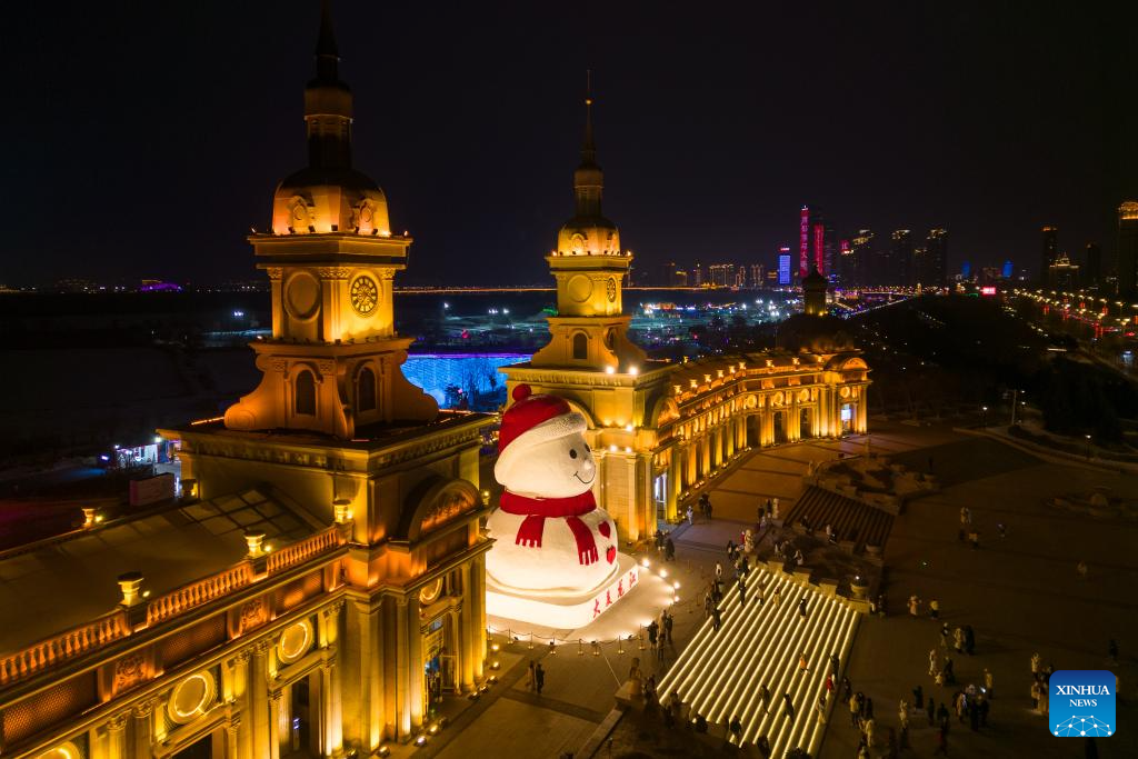 Tourists have fun around a giant snowman in Harbin, northeast China's Heilongjiang Province, Jan. 15, 2025. This winter, Harbin is drawing tourists with its stunning winter landscape, fueling a significant boom in its ice and snow tourism industry. (Xinhua/Zhang Tao)