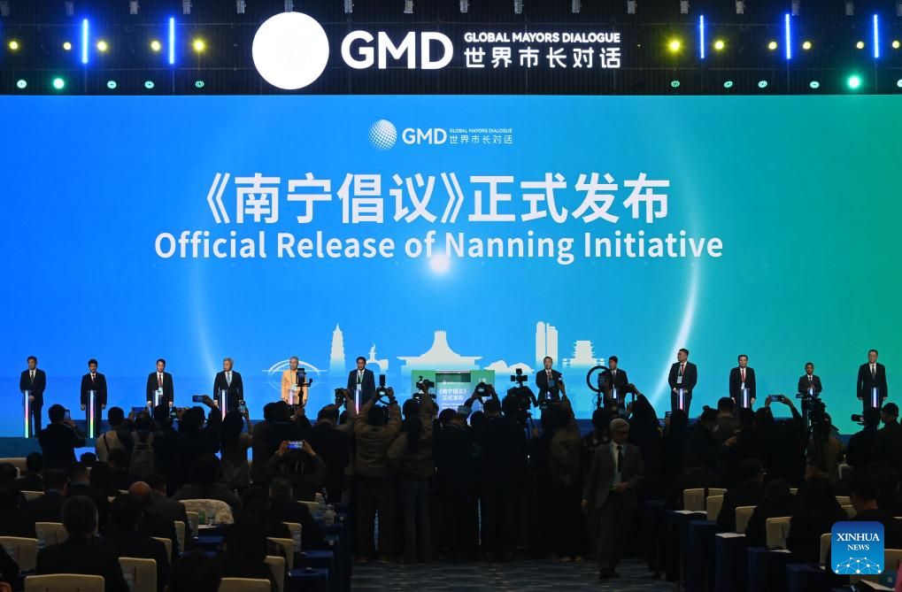 This photo taken on Jan. 16, 2025 shows the official release of the Nanning Initiative during the "Global Mayors Dialogue -- Nanning" event in Nanning, south China's Guangxi Zhuang Autonomous Region. (Xinhua/Lu Boan)