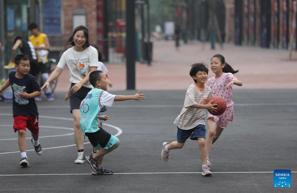 Children play basketball at the Hongmei cultural and creative industry park, which is transformed from an old factory, in Tiexi District of Shenyang, capital of northeast China's Liaoning Province, July 7, 2021. (Xinhua/Yang Qing)