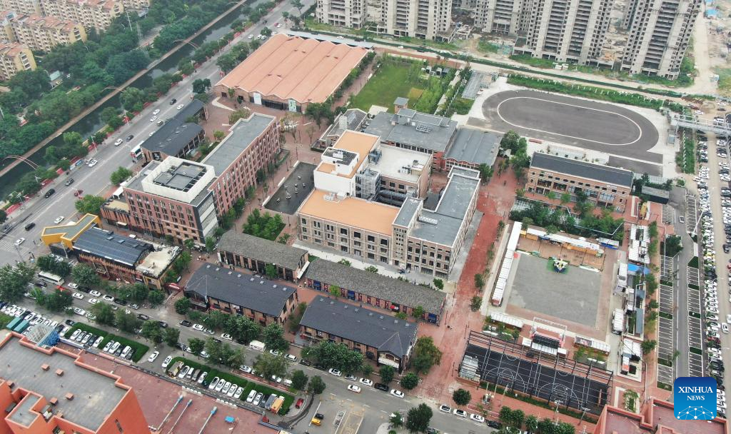 An aerial drone photo taken on July 7, 2021 shows the Hongmei cultural and creative industry park, which is transformed from an old factory, in Tiexi District of Shenyang, capital of northeast China's Liaoning Province. (Xinhua/Yang Qing)