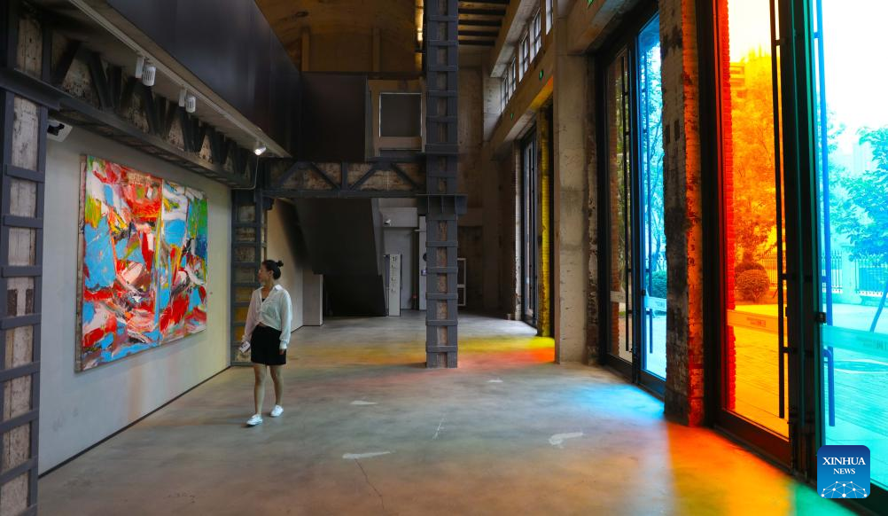 A visitor looks at a painting at an art gallery in the Hongmei cultural and creative industry park, which is transformed from an old factory, in Shenyang, capital of northeast China's Liaoning Province, July 7, 2021. (Xinhua/Yang Qing)