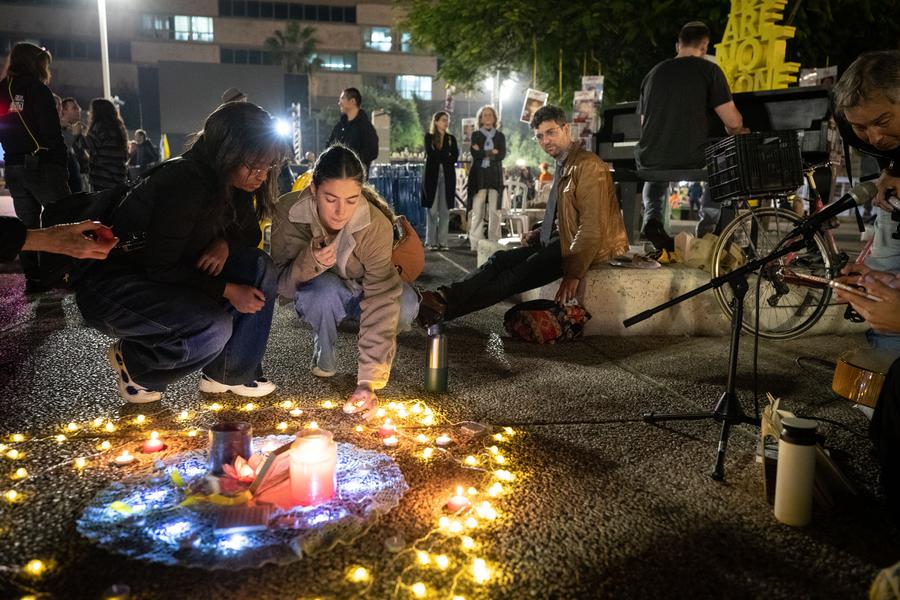 A woman places a candle amid reports of a ceasefire deal between Israel and Hamas, in a square in Tel Aviv, Israel, on Jan. 15, 2025. Israel and Hamas have agreed to a Gaza ceasefire-for-hostages deal following intensive mediation by Qatar, Egypt, and the United States, Qatar's prime minister announced on Wednesday. (Xinhua/Chen Junqing)