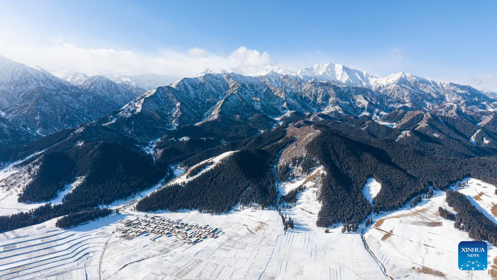 A drone photo taken on Jan. 15, 2025 shows the snow scenery of Qilian Mountains in Tianzhu County of Wuwei City, northwest China's Gansu Province. (Xinhua/Lang Bingbing)