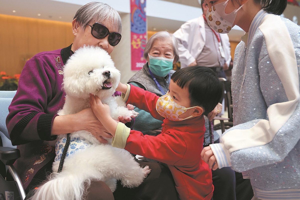 A therapy dog interacts with elderly people and a child during the event. (Wang Jing/China Daily)