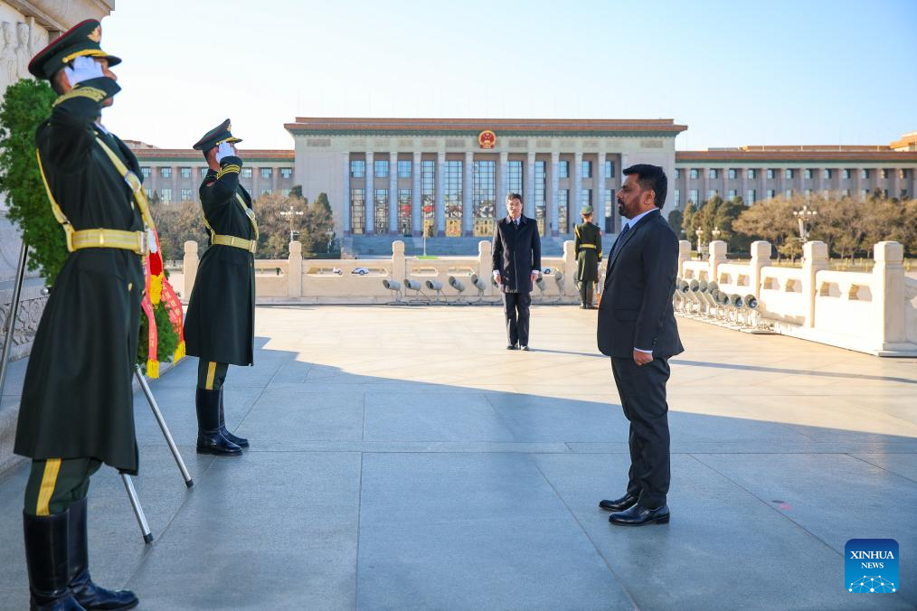 Sri Lankan President Anura Kumara Dissanayake lays a wreath at the Monument to the People's Heroes on Tian'anmen Square in Beijing, capital of China, Jan. 16, 2025. (Xinhua/Liu Bin)