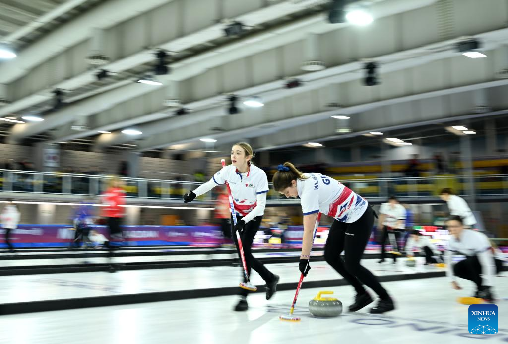 Holly Wilkie-Milne (C) of Britain competes during the Curling Women's Round Robin Session match between China and Britain of the 2025 FISU Winter World University Games in Turin, Italy, Jan. 16, 2025. (Xinhua/He Canling)