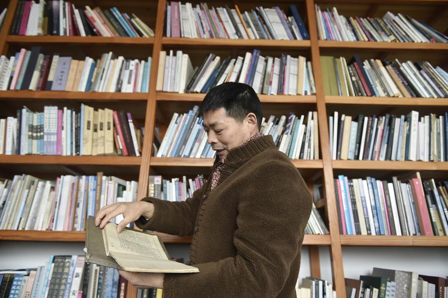 Hong Jianhua reads books on bamboo carvings at Huizhou Sculpture Museum in Huizhou District of Huangshan City, east China's Anhui Province, Jan. 7, 2025. (Xinhua/Lu Peng)