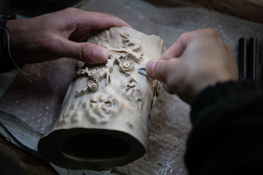 An apprentice of Hong Jianhua works on a bamboo carving at Huizhou Sculpture Museum in Huizhou District of Huangshan City, east China's Anhui Province, Jan. 7, 2025. (Xinhua/Zhang Duan)