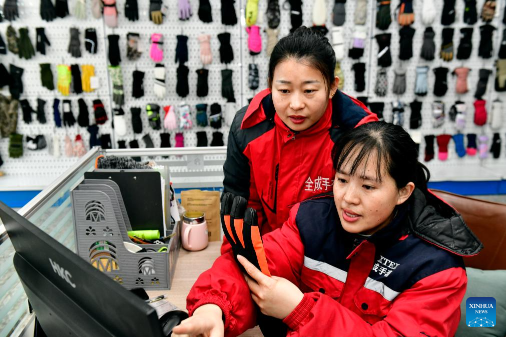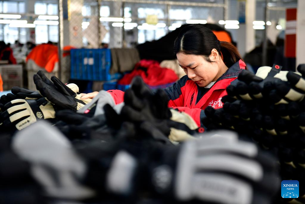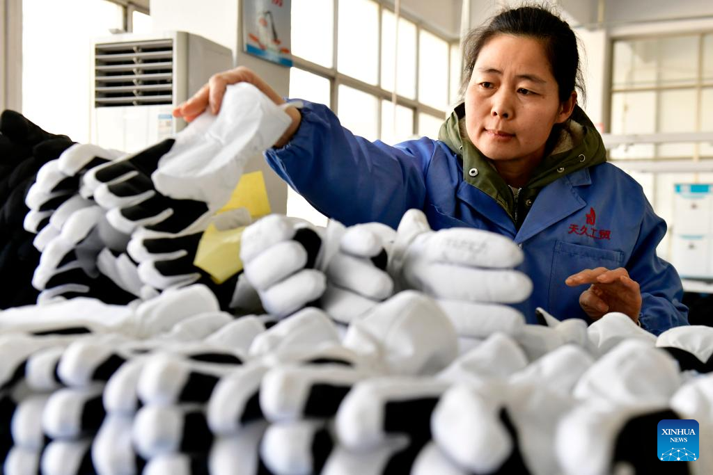 An employee inspects ski gloves at a company in Jiaxiang County, Jining City, east China's Shandong Province, Jan. 17, 2025. Jiaxiang County is one of the ski glove production bases in China. The glove products are exported to more than 60 countries and regions in Asia, Europe and the Americas. (Xinhua/Guo Xulei)
