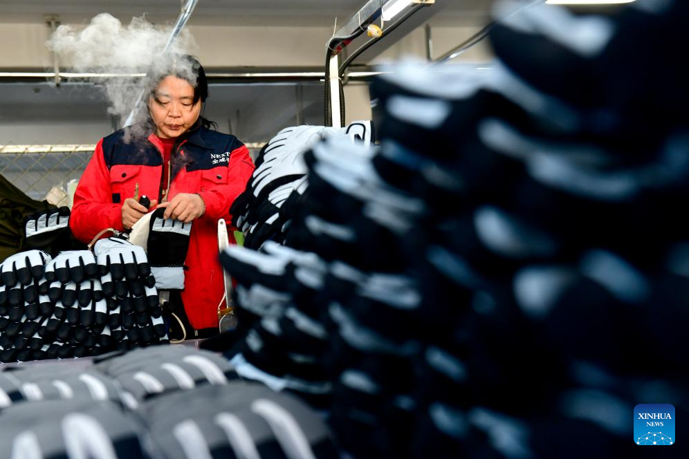An employee irons ski gloves at a company in Jiaxiang County, Jining City, east China's Shandong Province, Jan. 17, 2025. Jiaxiang County is one of the ski glove production bases in China. The glove products are exported to more than 60 countries and regions in Asia, Europe and the Americas. (Xinhua/Guo Xulei)