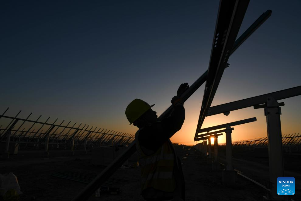 A worker fixes photovoltaic panel bracket at the Shichengzi photovoltaic power station in Hami City, northwest China's Xinjiang Uygur Autonomous Region, Sept. 9, 2024. From the land to the sea, China's pursuit of green energy has promoted the development of wind power and solar power industries. In the context of the global energy transition from fossil fuels to renewable energy sources, China's legions of wind turbines and seas of photovoltaic panels are quite eye-catching. (Xinhua/Hu Huhu)