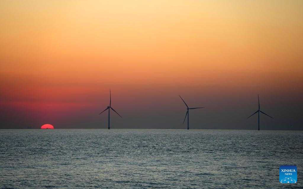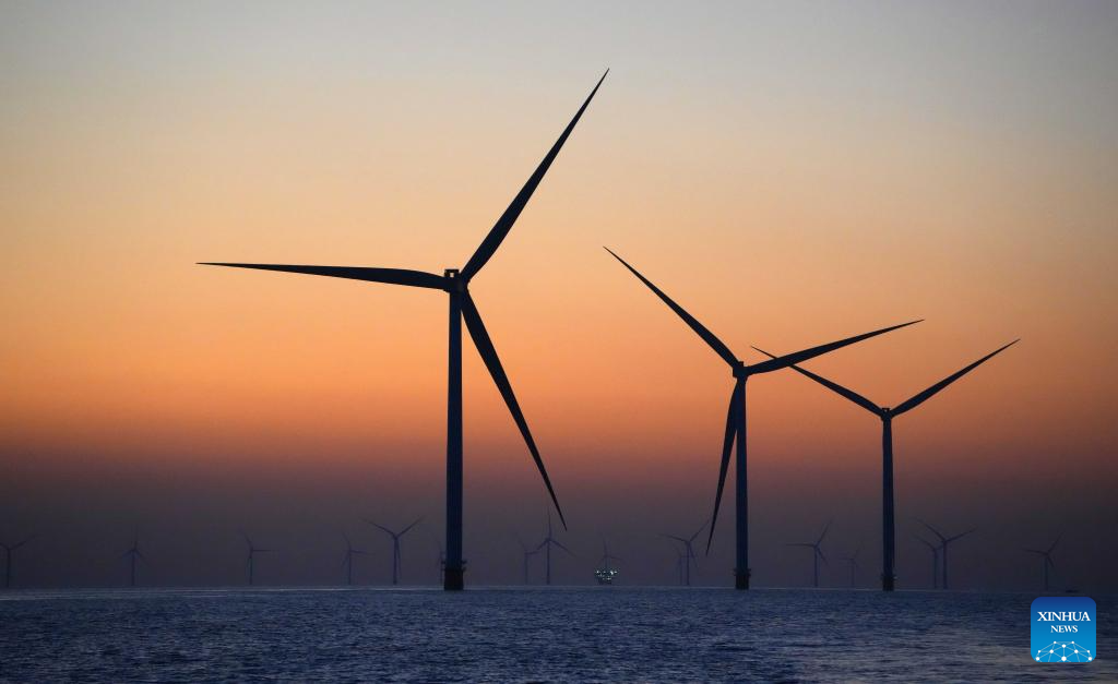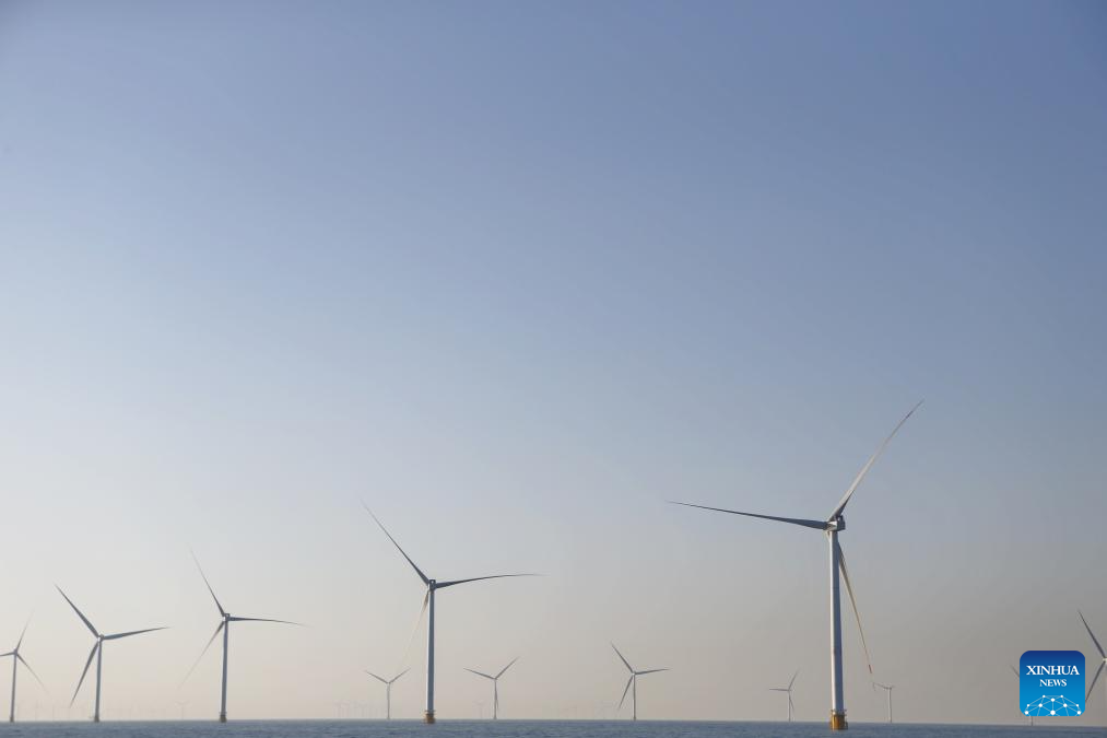 Offshore wind turbines are pictured in the waters of Laizhou City, east China's Shandong Province, Jan. 7, 2025. From the land to the sea, China's pursuit of green energy has promoted the development of wind power and solar power industries. In the context of the global energy transition from fossil fuels to renewable energy sources, China's legions of wind turbines and seas of photovoltaic panels are quite eye-catching. (Xinhua/Xu Suhui)