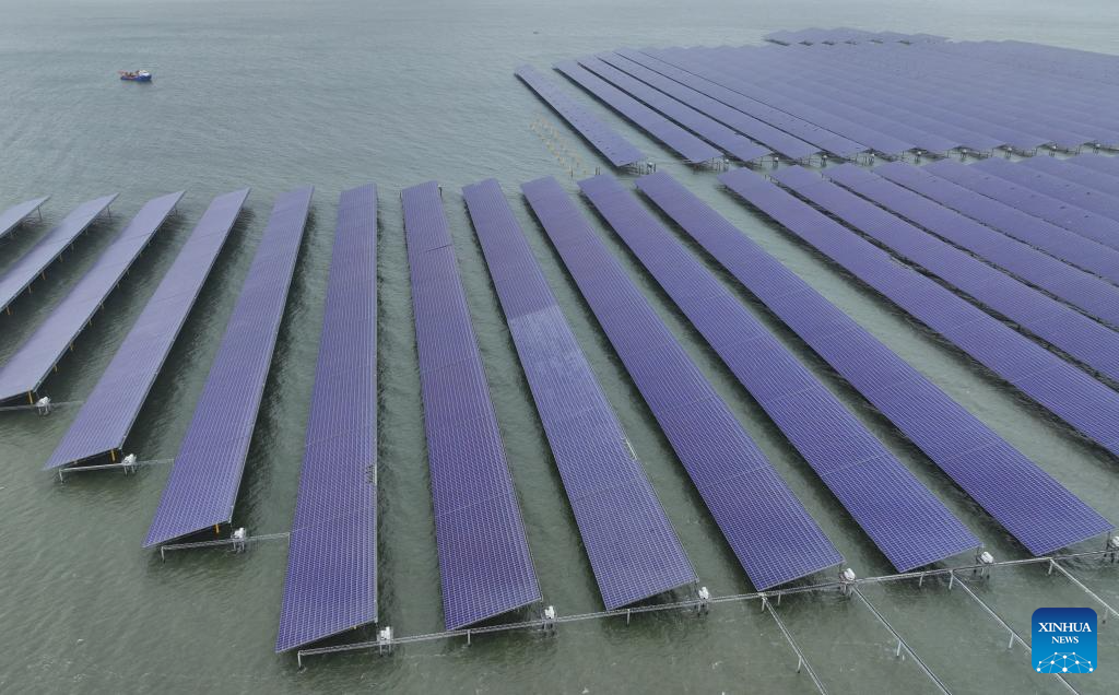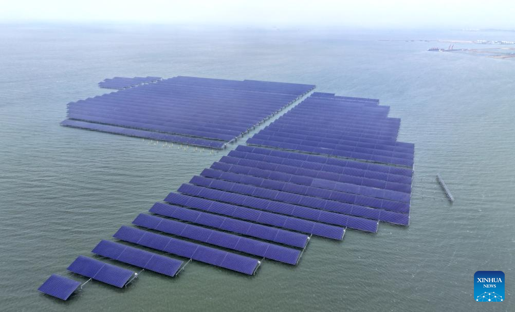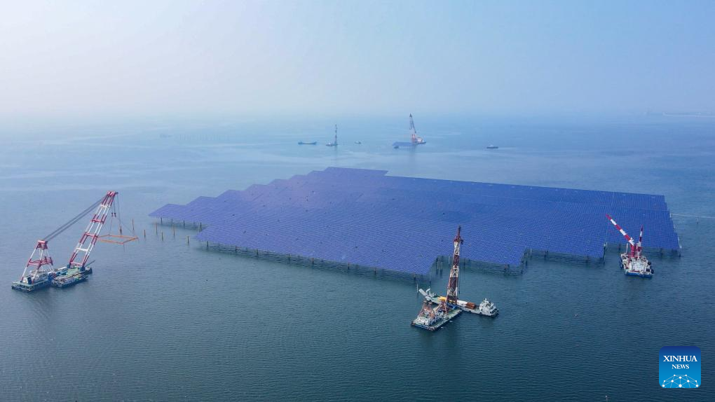 An aerial drone photo taken on Nov. 15, 2024 shows an offshore photovoltaic power project under construction in the waters of Zhaoyuan City, east China's Shandong Province. From the land to the sea, China's pursuit of green energy has promoted the development of wind power and solar power industries. In the context of the global energy transition from fossil fuels to renewable energy sources, China's legions of wind turbines and seas of photovoltaic panels are quite eye-catching. (Photo by Wang Shengwei/Xinhua)