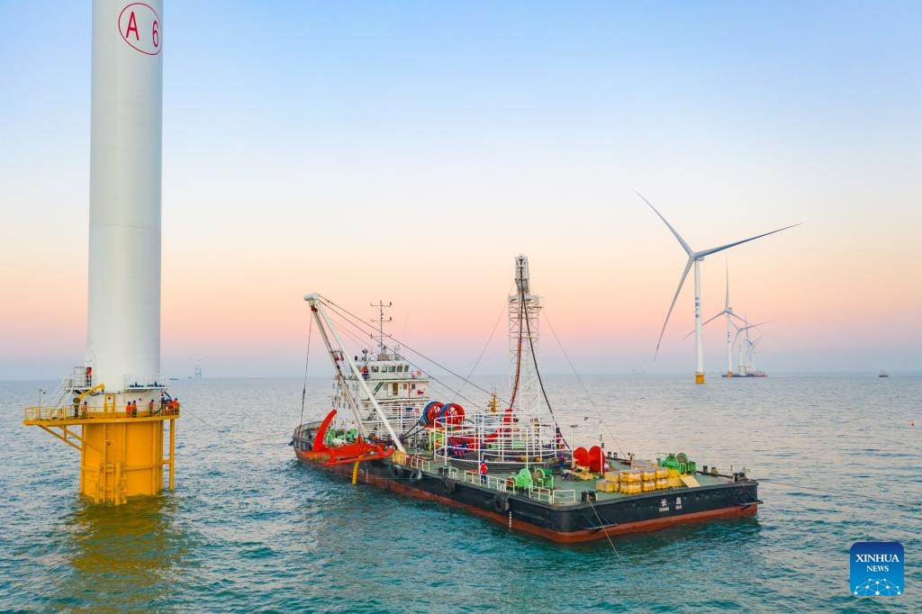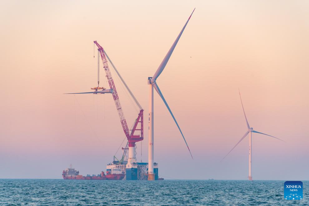 Staff workers assemble an offshore wind turbine in the waters of Laizhou City, east China's Shandong Province, Nov. 15, 2022. From the land to the sea, China's pursuit of green energy has promoted the development of wind power and solar power industries. In the context of the global energy transition from fossil fuels to renewable energy sources, China's legions of wind turbines and seas of photovoltaic panels are quite eye-catching. (Photo by Lin Songfei/Xinhua)