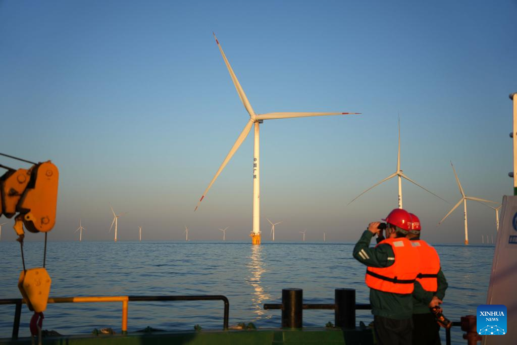 Staff members work on an offshore wind turbine in the waters of Laizhou City, east China's Shandong Province, Nov. 15, 2022. From the land to the sea, China's pursuit of green energy has promoted the development of wind power and solar power industries. In the context of the global energy transition from fossil fuels to renewable energy sources, China's legions of wind turbines and seas of photovoltaic panels are quite eye-catching. (Photo by Lin Songfei/Xinhua)