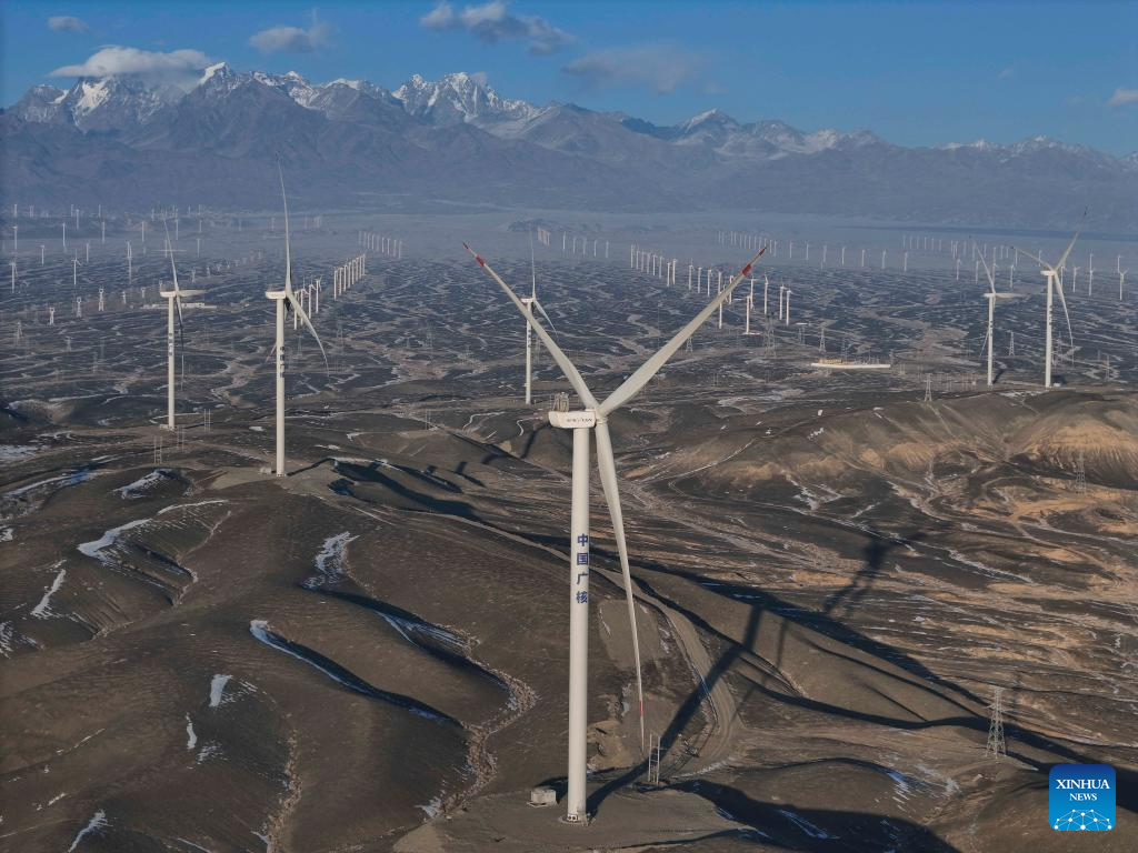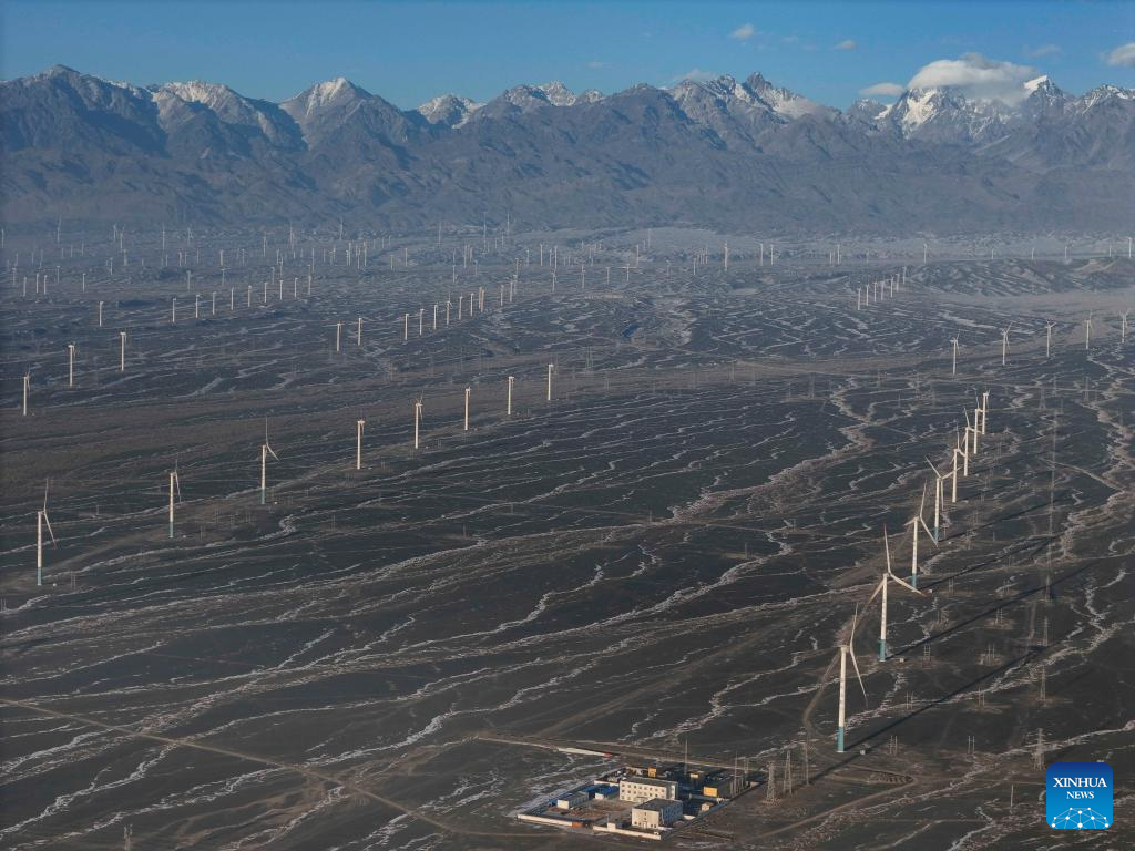 An aerial drone photo taken on Dec. 23, 2024 shows wind turbines in Dabancheng, also known as "China's Wind Valley," in northwest China's Xinjiang Uygur Autonomous Region. From the land to the sea, China's pursuit of green energy has promoted the development of wind power and solar power industries. In the context of the global energy transition from fossil fuels to renewable energy sources, China's legions of wind turbines and seas of photovoltaic panels are quite eye-catching. (Xinhua/Hu Huhu)