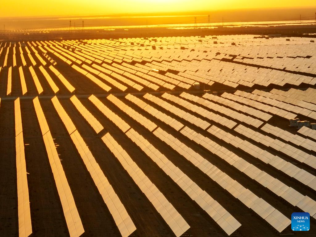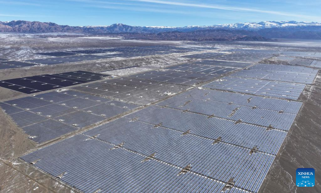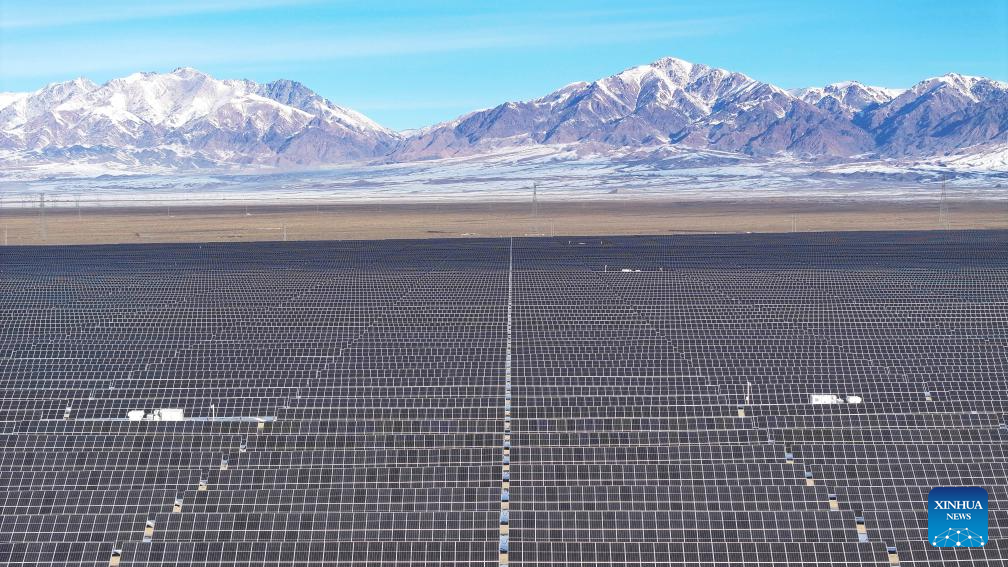 An aerial drone photo taken on Jan. 6, 2025 shows a partial view of the Shichengzi photovoltaic power station in Hami City, northwest China's Xinjiang Uygur Autonomous Region. From the land to the sea, China's pursuit of green energy has promoted the development of wind power and solar power industries. In the context of the global energy transition from fossil fuels to renewable energy sources, China's legions of wind turbines and seas of photovoltaic panels are quite eye-catching. (Photo by Feng Yang/Xinhua)