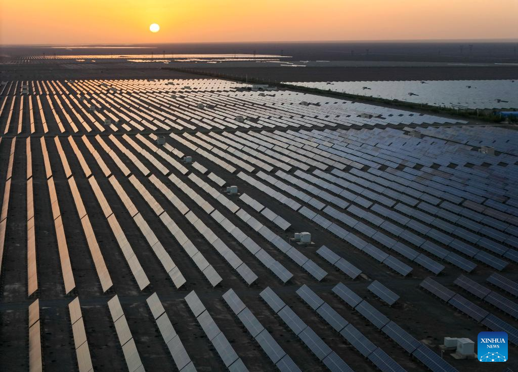 An aerial drone photo taken on Sept. 8, 2024 shows a partial view of the Shichengzi photovoltaic power station in Hami City, northwest China's Xinjiang Uygur Autonomous Region. From the land to the sea, China's pursuit of green energy has promoted the development of wind power and solar power industries. In the context of the global energy transition from fossil fuels to renewable energy sources, China's legions of wind turbines and seas of photovoltaic panels are quite eye-catching. (Xinhua/Hu Huhu)