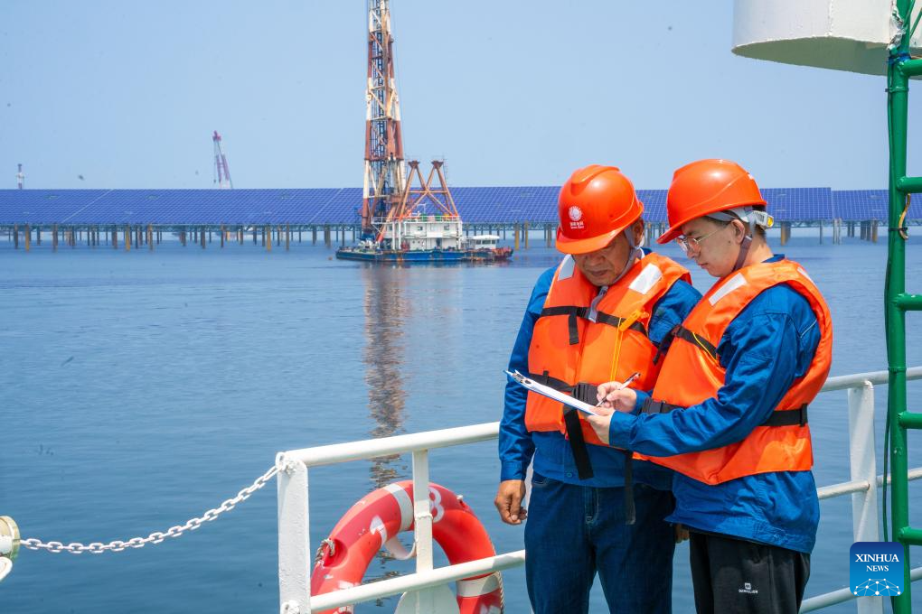 Staff members of State Grid Yantai electric power supply company work at an offshore photovoltaic power project under construction in the waters of Zhaoyuan City, east China's Shandong Province, Nov. 15, 2024. From the land to the sea, China's pursuit of green energy has promoted the development of wind power and solar power industries. In the context of the global energy transition from fossil fuels to renewable energy sources, China's legions of wind turbines and seas of photovoltaic panels are quite eye-catching. (Photo by Wang Shengwei/Xinhua)