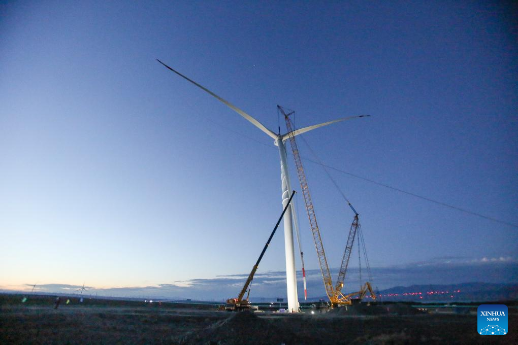 Staff workers erect a wind turbine in Dabancheng, also known as "China's Wind Valley," in northwest China's Xinjiang Uygur Autonomous Region, Aug. 4, 2023. From the land to the sea, China's pursuit of green energy has promoted the development of wind power and solar power industries. In the context of the global energy transition from fossil fuels to renewable energy sources, China's legions of wind turbines and seas of photovoltaic panels are quite eye-catching. (Xinhua/Hao Zhao)