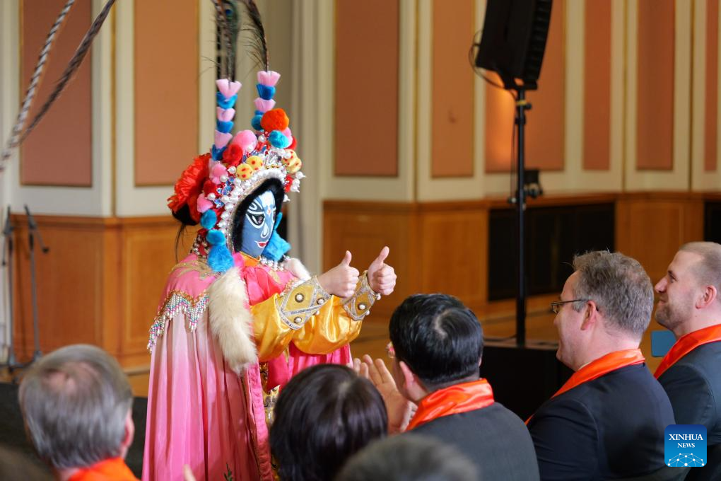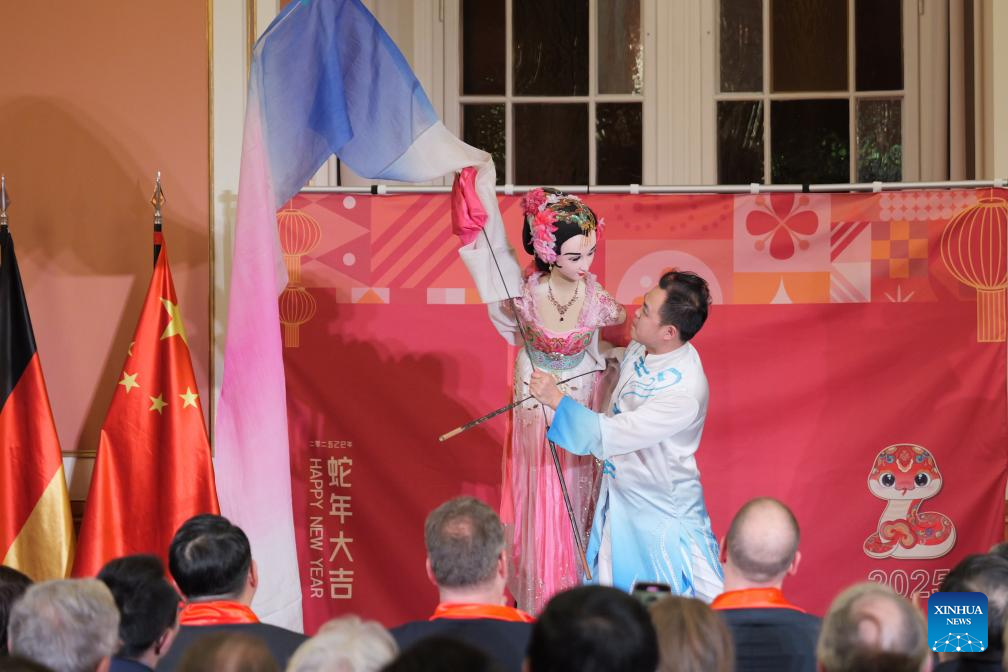 A puppetry artist performs during the Snake "Happy Spring Festival" New Year Celebration Gala and Spring Festival Reception at the Red City Hall in Berlin, Germany, Jan. 17, 2025. The 2025 Year of the Snake "Happy Spring Festival" New Year Celebration Gala and Spring Festival Reception was held here on Friday with the presence of more than 350 guests from both China and Germany. (Xinhua/Tai Sicong)