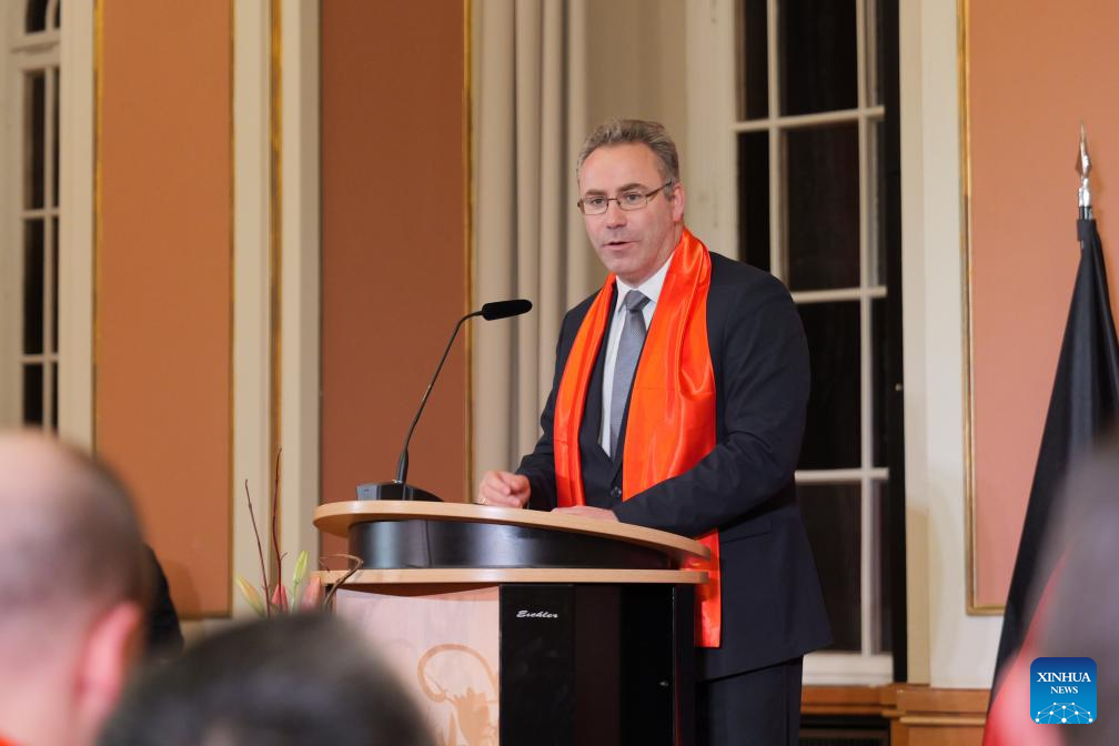 Florian Hauer, State Secretary of the Berlin Municipal Government, addresses the 2025 Year of the Snake "Happy Spring Festival" New Year Celebration Gala and Spring Festival Reception at Berlin's Red City Hall in Berlin, Germany, on Jan. 17, 2025. The 2025 Year of the Snake "Happy Spring Festival" New Year Celebration Gala and Spring Festival Reception was held here on Friday with the presence of more than 350 guests from both China and Germany. (Xinhua/Tai Sicong)
