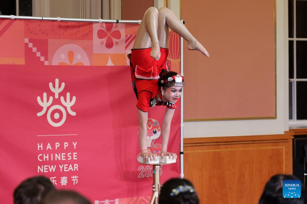 An acrobat performs during the Snake "Happy Spring Festival" New Year Celebration Gala and Spring Festival Reception at the Red City Hall in Berlin, Germany, Jan. 17, 2025. The 2025 Year of the Snake "Happy Spring Festival" New Year Celebration Gala and Spring Festival Reception was held here on Friday with the presence of more than 350 guests from both China and Germany. (Xinhua/Tai Sicong)