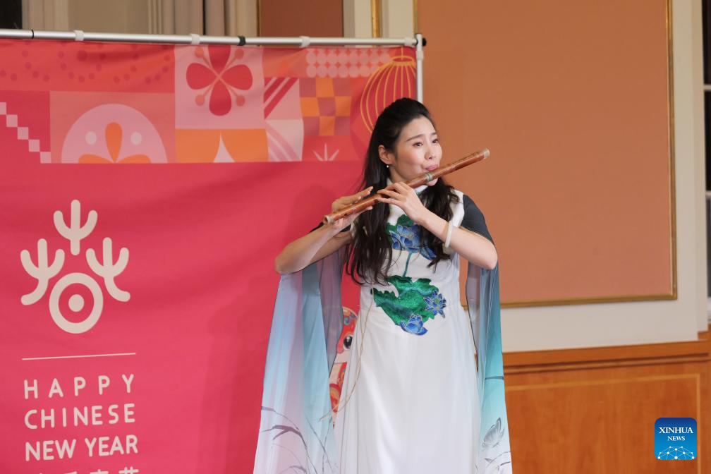 An artist plays bamboo flute during the Snake "Happy Spring Festival" New Year Celebration Gala and Spring Festival Reception at the Red City Hall in Berlin, Germany, Jan. 17, 2025. The 2025 Year of the Snake "Happy Spring Festival" New Year Celebration Gala and Spring Festival Reception was held here on Friday with the presence of more than 350 guests from both China and Germany. (Xinhua/Tai Sicong)
