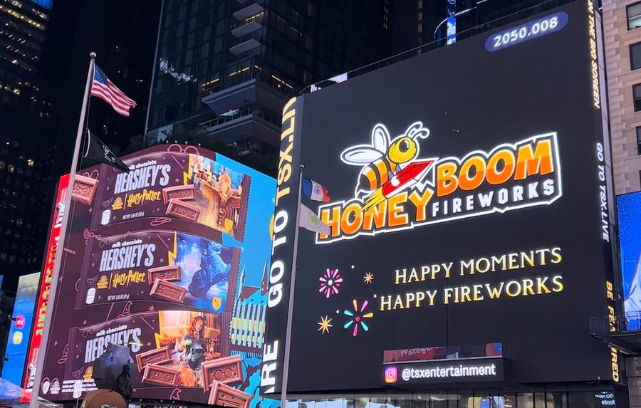 This photo taken on Sept. 21, 2023 shows an advertisement of Liuyang Happy Fireworks Export Trade Co., Ltd. at Times Square in New York, the United States. (Xinhua)