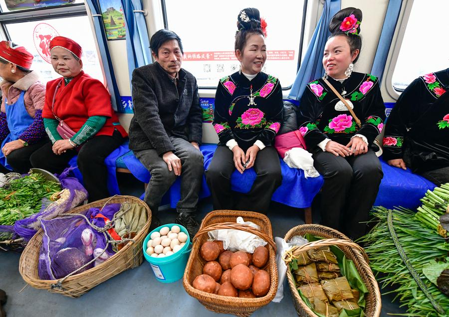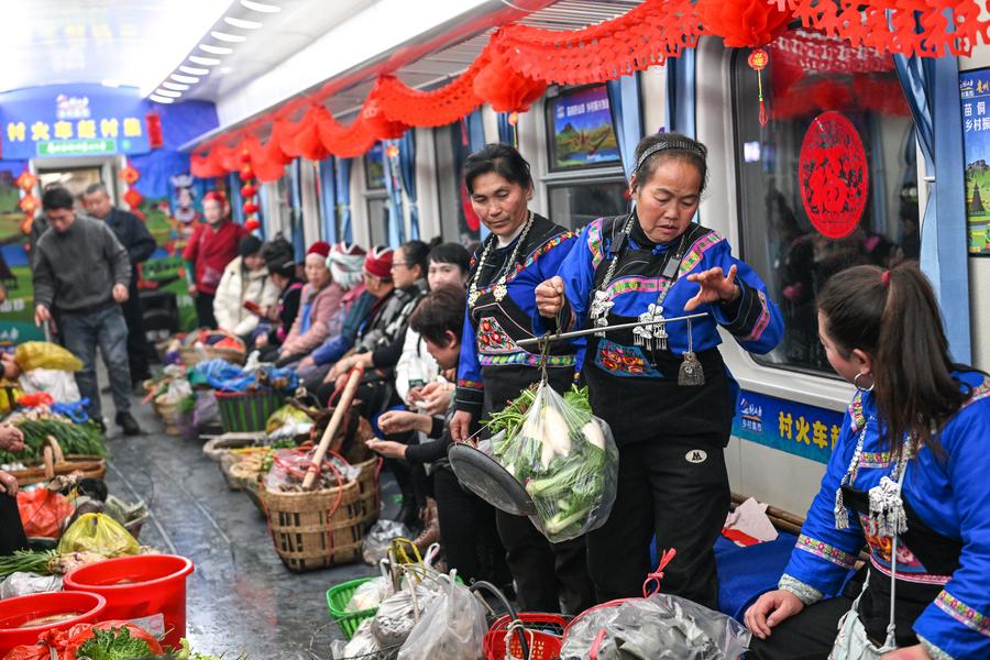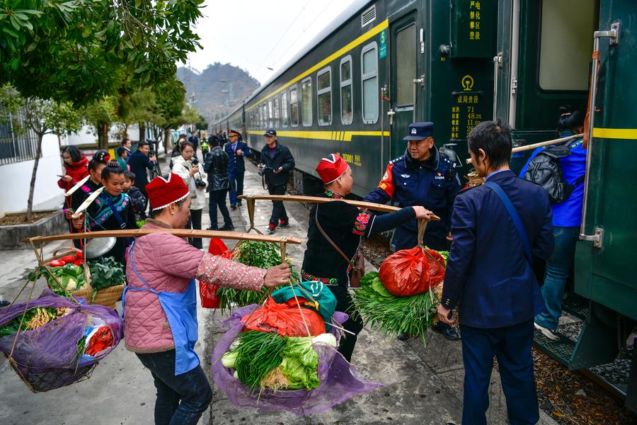 Villagers sell goods on train No. 5640 in southwest China's Guizhou Province, Jan. 18, 2025. (Xinhua/Yang Wenbin)