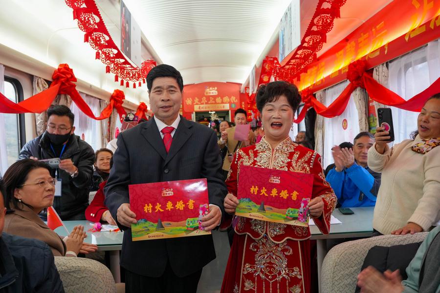 A couple celebrate their 50th anniversary of marriage on the train No. 5640 in southwest China's Guizhou Province, Jan. 18, 2025. (Photo by Long Jianrui/Xinhua)