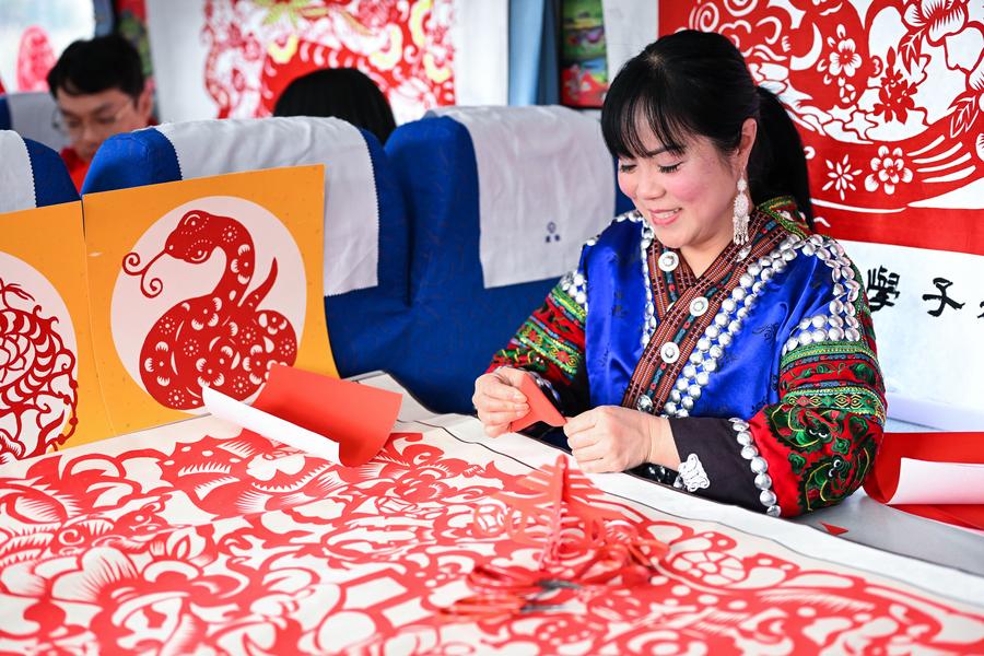 An inheritor of intangible cultural heritage displays paper-cutting skills for passengers on train No. 5640 in southwest China's Guizhou Province, Jan. 18, 2025. (Xinhua/Yang Wenbin)