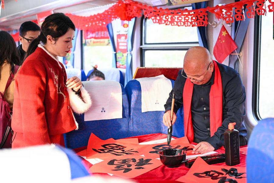 A calligrapher creates calligraphy works of Chinese character "Fu", which means "good fortune", on train No. 5640 in southwest China's Guizhou Province, Jan. 18, 2025. (Xinhua/Yang Wenbin)