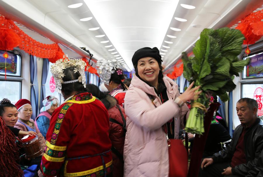 KAILI, Jan. 19 (Xinhua) -- A "village gala" was held on the train No. 5640 running on the Guiyang-Yuping railway on Saturday, during which folk customs and specialty food of Miao and Dong ethnic groups were displayed for passengers along the way.