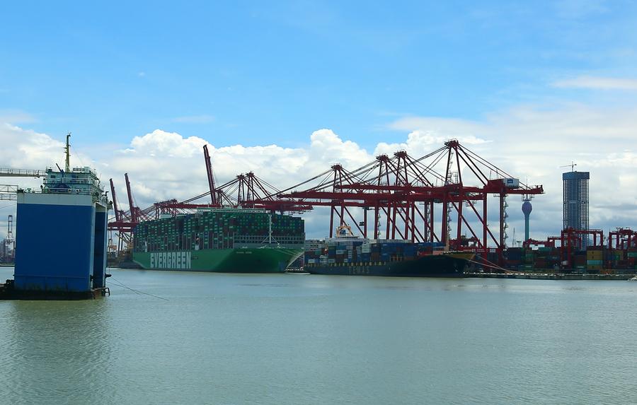Photo taken on Oct. 6, 2021 shows the world's largest container vessel "Ever Ace" at the Colombo Port in the Sri Lankan capital. (Photo by Ajith Perera/Xinhua)